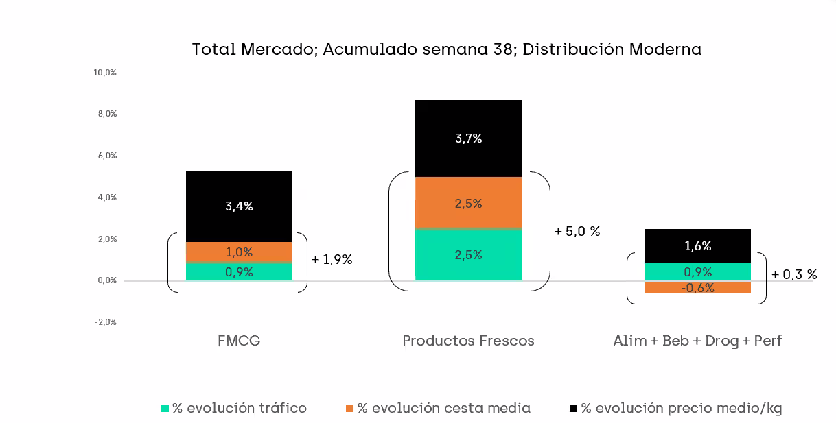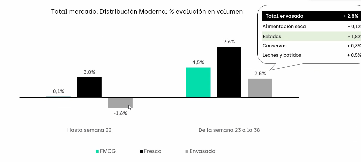 Además, las ventas en volumen han tenido un punto de inflexión en verano. Hasta la semana 22 la evolución ha sido del +0,1%, con un alza del 3% en la sección de frescos y una caída del 1,6% en la alimentación envasada.