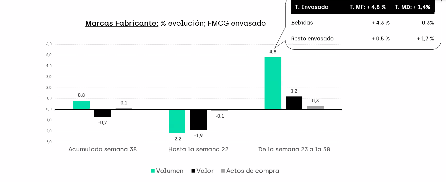 En este sentido, de la semana 23 a la 38 (entre junio y septiembre), la MDF ha crecido un 4,8% en volumen en el total de alimentación envasada, frente al incremento del 1,4% de la MDD, que sufre una desaceleración de sus ventas. Además, en bebidas, los fabricantes han crecido un 4,3%, frente a una caída del 0,3% de la MDD.