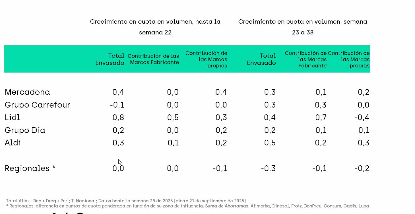 En este sentido, Lidl es el mayor ejemplo de este cambio de tendencia. De junio a septiembre, la marca de fabricante ha contribuido en 0,7 puntos al crecimiento de la cuota en volumen de Lidl, mientras que su marca propia le ha hecho perder 0,4 puntos.