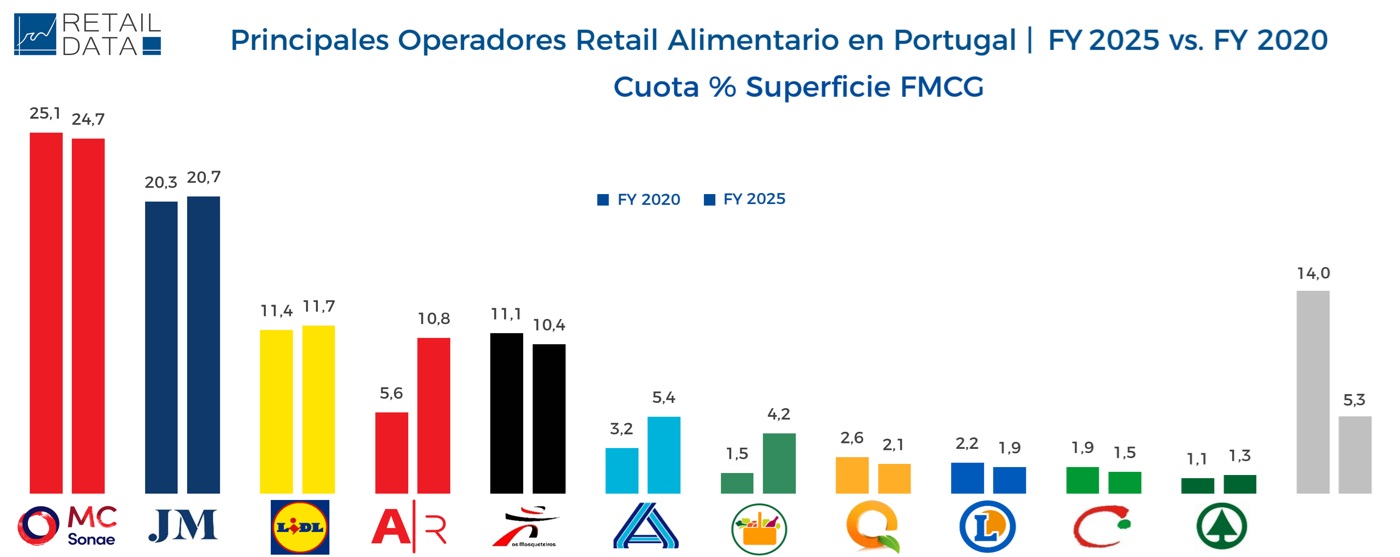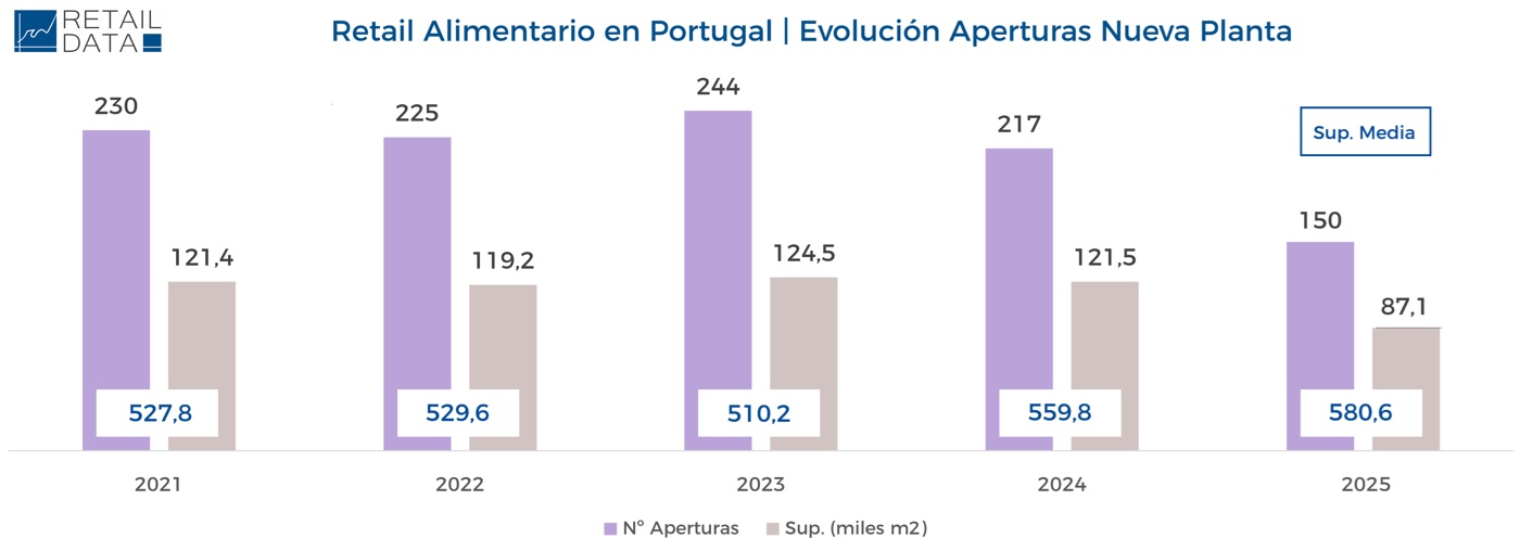 En total, durante los últimos cinco años se han abierto o renovado 1.900 tiendas de distribución con base alimentaria en Portugal, lo que supone que el 39% del total de la red, situada en 4.745 unidades a cierre de 2025. La superficie comercial creció un 2,35% en 2025 y el acumulado frente al cierre de 2020 se sitúa en el 16%.