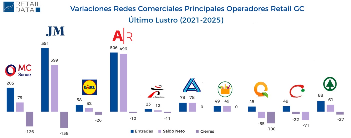 MC Sonae ha cerrado el quinquenio con un crecimiento neto de 79 unidades tras 205 aperturas y 126 cierres. El mayor protagonismo aperturista ha correspondido a Continente bom día, con casi 80 nuevos centros, y al modelo Continente Modelo, con una docena de establecimientos. Asimismo, también es reseñable que Aldi acumula 78 aperturas en el último lustro; Lidl, 58; y Mercadona, 49.