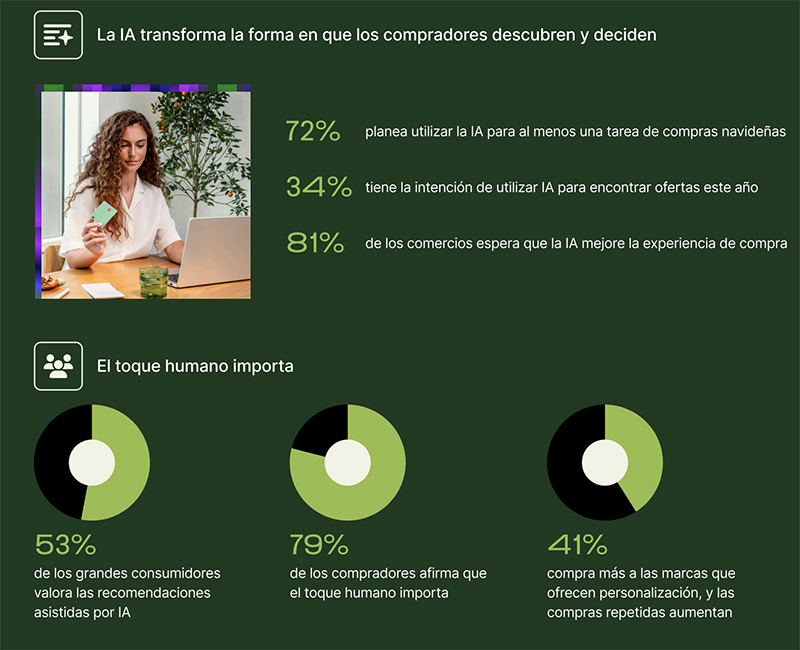 Además, España se sitúa entre los mercados líderes en adopción de inteligencia artificial (IA) aplicada a las compras. El 72% de los consumidores afirma que la utilizará para encontrar ofertas o descubrir productos, frente al 64% global. Asimismo, el 58% considera que la IA mejorará su experiencia de compra y el 56% cree que le ayudará a ahorrar dinero.