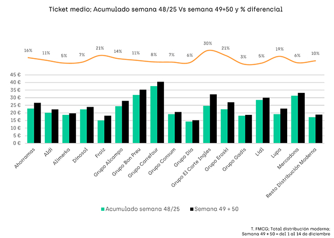 En conjunto, el ticket medio del sector de gran consumo alcanza los 26,4 euros en las semanas 49 y 50, frente a los 24,3 euros del acumulado del resto del año, lo que supone un incremento de dos euros por compra. En términos de volumen, entre las semanas 1 y 48 del año se promedian 11,4 unidades por acto de compra; en las semanas 49-50, 11,6 unidades.