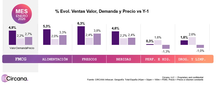 infoRETAIL.- El gran consumo ha cerrado el primer mes del año con un incremento de las ventas en valor del 5,6% respecto al mismo periodo de 2025, según datos de Circana, que señala que la demanda y el precio han crecido un 3,2% y 2,5% interanual, respectivamente.