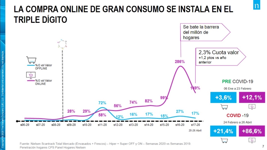 "El canal online ha registrado unas cifras inesperadas", ha reconocido directora general de Nielsen Iberia, Patricia Daimiel, quien explica que el crecimiento cosechado por el comercio electrónico en estas semanas era el esperado "en meses o años".
