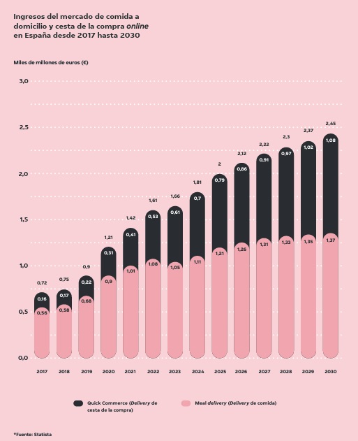 infoRETAIL.- El quick commerce (q-commerce) de la distribución alimentaria en España crecerá un 36,7% en los próximos cinco años. Así lo indican los datos de Statista recogidos en el 'Gastrómetro 2025 de Just Eat', que señalan que el sector ha cerrado 2025 con una facturación de 790 millones de euros, con una proyección a largo plazo de crecimiento sostenido que le llevará a superar la barrera de los 1.080 millones en 2030.