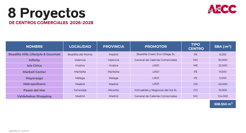 Por otro lado, también se prevé la inauguración de dos centros comerciales grandes o muy grandes (Valdebebas Shopping, Infinity y Metropolitano), mientras que el resto serán centros comerciales medianos, pequeños y de ocio. En total, sumarán 308.550 m2 de SBA.