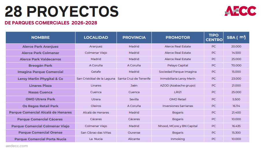 En este sentido, al igual que en los últimos ejercicios, se mantiene la tendencia al alza de apertura de parques comerciales, que protagonizarán 28 de los nuevos proyectos anunciados para los próximos tres años (el 78%, aproximadamente), sumando una superficie bruta alquilable (SBA) de 626.079 metros cuadrados (m2).