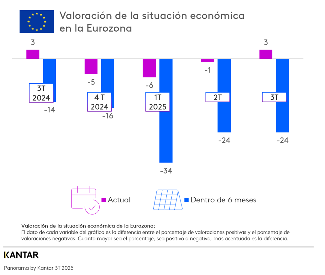 El estudio revela que la percepción económica de la Eurozona muestra una leve mejoría, con la confianza regresando a niveles similares a los de hace un año. Sin embargo, los consumidores siguen teniendo cautela en el corto plazo debido a la incertidumbre geopolítica y comercial: la valoración actual de la situación económica es de +3 puntos, pero las expectativas para dentro de seis meses no han variado respecto al segundo trimestre (-24 puntos).