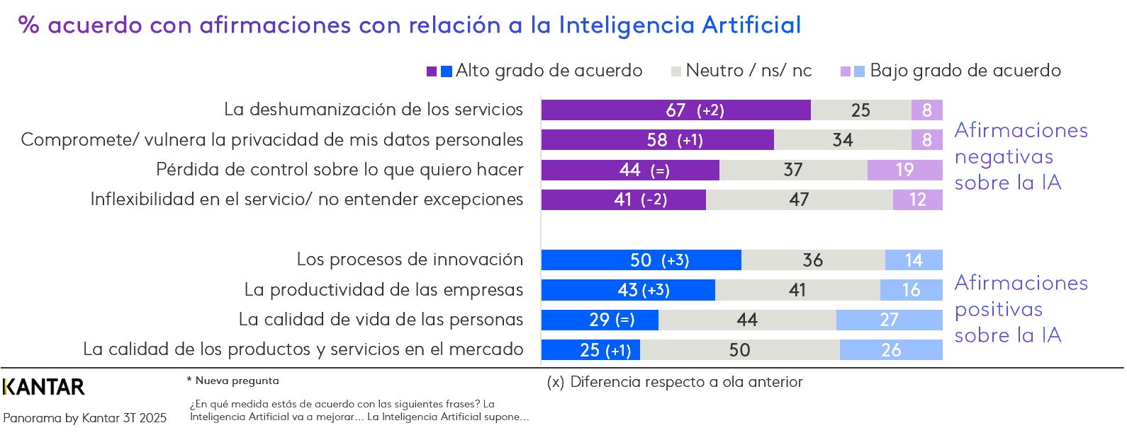 Aunque se observa una ligera mejora en la percepción de la IA como motor de innovación (50%) y productividad (43%), las afirmaciones negativas siguen predominando entre los consumidores. Solo el 29% cree que la IA mejorará la calidad de vida de las personas y apenas el 25% la calidad de los productos y servicios en el mercado.