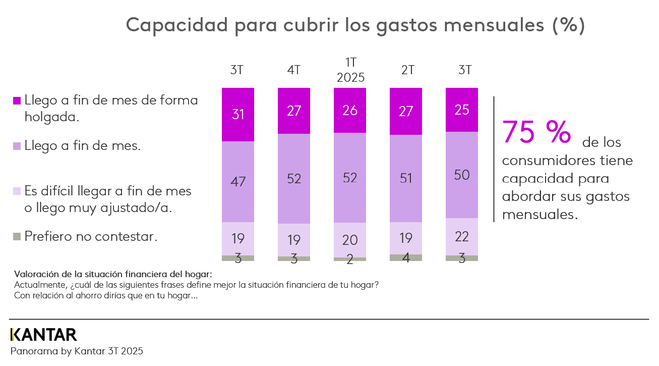 La capacidad de los hogares para cubrir sus gastos mensuales se mantiene sin cambios significativos, con un 75% de los consumidores que menciona llegar a fin de mes. Sin embargo, continúa existiendo una cifra constante de consumidores, en torno al 20%, para los que es difícil llegar a fin de mes o llegan de forma muy ajustada. De este modo, la capacidad de ahorro de los españoles también se mantiene estable, con e 80% de consumidores que dice tener margen para ahorrar.
