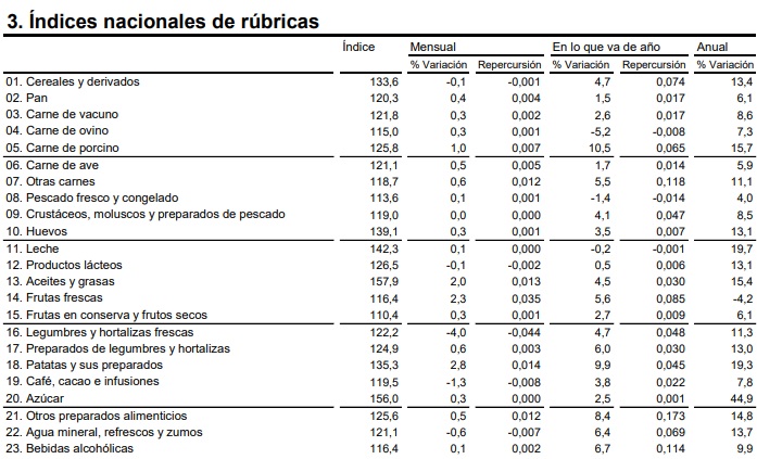 En la comparación interanual (junio de 2023 vs junio de 2022), todos los alimentos han aumentado sus precios, con la excepción de las frutas frescas (-4,2%). Las mayores subidas han correspondido al azúcar (44,9%), la leche (+19,7%), la carne de porcino (+15,7%), los aceites y grasas (+15,4%) y otros preparados alimenticios (+14,8%).