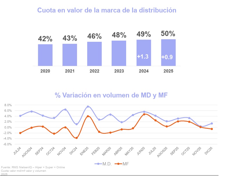 Sin embargo, esa convivencia entre los distintos tipos de marca se hace cada vez más palpable, atendiendo en 2025 a un acercamiento entre las marcas de fabricante (MDF) y MDD fruto, en parte, de un mayor esfuerzo promocional de las primeras.