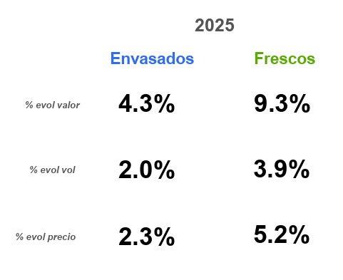 Por su parte, el alza de los productos envasados ha sido de menos de la mitad que en frescos (+4,3%) y con los refrigerados/congelados y las bebidas no alcohólicas como las categorías más dinámicas, anotando incrementos en el volumen del 4,3% para los primeros y de un 3,1% para las segundas, respecto a 2024. En este caso, destacan las soluciones de comida preparada, un mercado que ya factura 3.750 millones de euros, un 11% más respecto a 2024