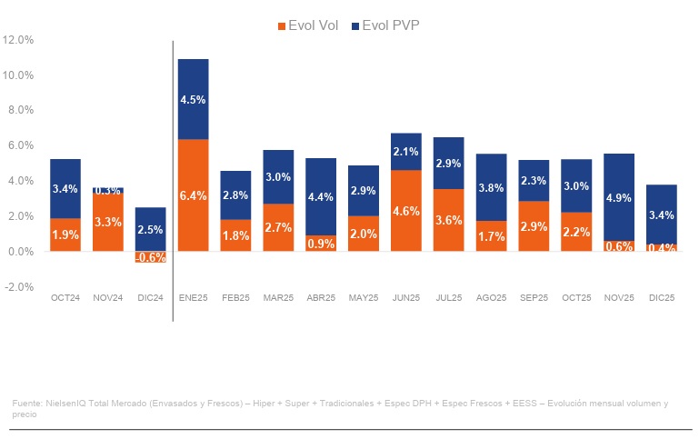 El gran consumo ha facturado 131.000 millones de euros en 2025, lo que supone un incremento del 5,8% respecto al año anterior, debido a un comportamiento positivo de los volúmenes, que registraron un incremento del 2,5% y en un entorno en el que el precio promedio ha experimentado un repunte del 3,2%.