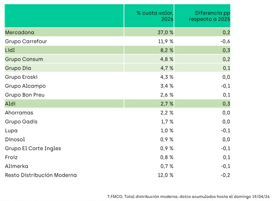 Con evolución plana aparecen Eroski (que se queda con una cuota del 4,3%), Ahorramas (2,2%), Gadisa (1,7%) y Dinosol (0,9%), mientras que la mayor caída corresponde a Carrefour, que pierde 0,6 puntos de cuota hasta quedarse en el 11,9%. También ceden, aunque solo 0,1 puntos, Alcampo (cuya cuota disminuye hasta el 3,4%), Lupa (1%), Grupo El Corte Inglés (0,9%) y Alimerka (0,7%). El resto de operadores de la distribución moderna también pierde 0,2 puntos y su peso queda en el 12%.