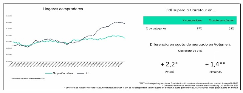 Y ello pese a que Lidl ya supera a Carrefour en cuota en volumen en el 28% de las categorías, y en compradores en el 57% de las categorías. No obstante, en la actualidad, la diferencia de cuota de mercado en volumen es de 2,2 puntos en favor de Carrefour, gracias al mayor tamaño de sus cestas (ver gráfico inferior). “Aún tiene un largo trecho que recorrer”, señala Bonfill en referencia a la distancia que separa a Lidl del grupo francés.