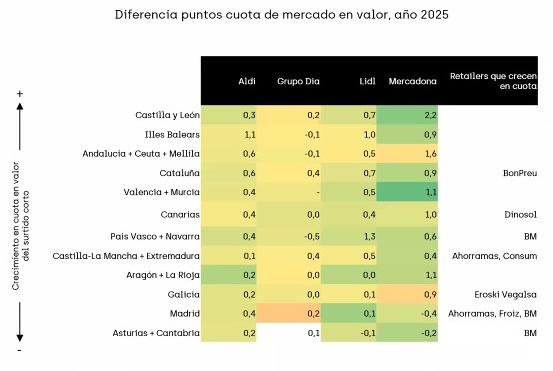 Otro elemento destacado del canal discount en España es la expansión de Aldi. De hecho, la cadena dirigida por Valentín Lumbreras es la única que ha sido capaz de ganar cuota de mercado en valor en todas las comunidades autónomas durante 2025.
