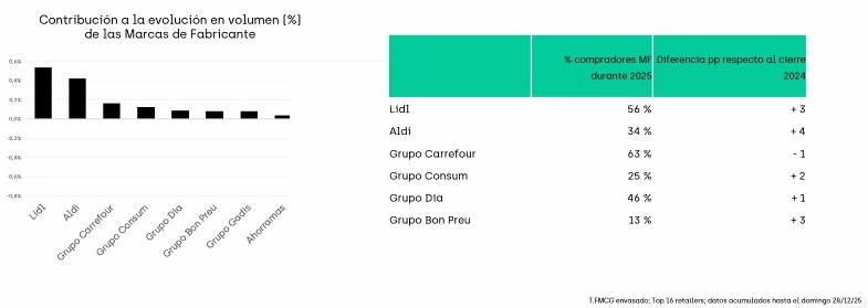 Otro dato relevante que pone de manifiesto el papel del discount en la evolución de la MDF en 2025 es que el 37% de las 30 SKU de mayor crecimiento en volumen del año está en el lineal de Lidl, lo que supone, por ejemplo diez puntos más que Mercadona (27%).