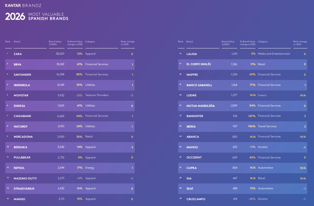 En este ranking general destaca especialmente la presencia y posicionamiento de enseñas de moda. De hecho, Zara encabeza la clasificación, con un valor de 38.029 millones de dólares (32.905 millones de euros). Se mantiene en el primer puesto desde la primera edición en 2017. Kantar señala que su dominio en el sector, su autoridad en la moda y su capacidad constante para cumplir con las expectativas del consumidor, impulsan su posición destacada tanto en precios como en diferenciación.