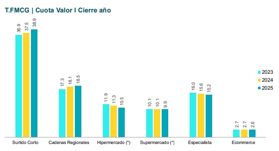 Estas cuatro evoluciones individuales han provocado que las cadenas de surtido corto sean las que más han crecido en 2025 (+1,4 pp vs 2024) y ya concentran el 38,9% de cuota.